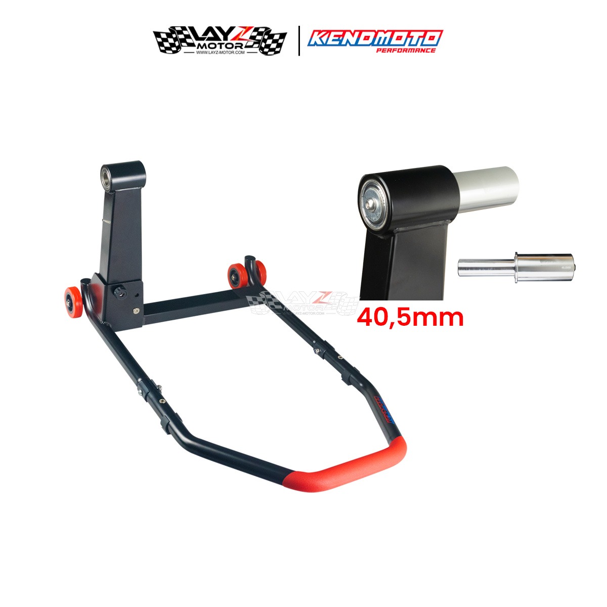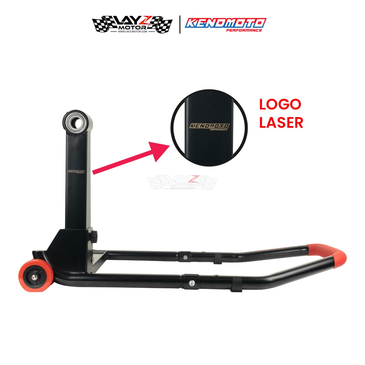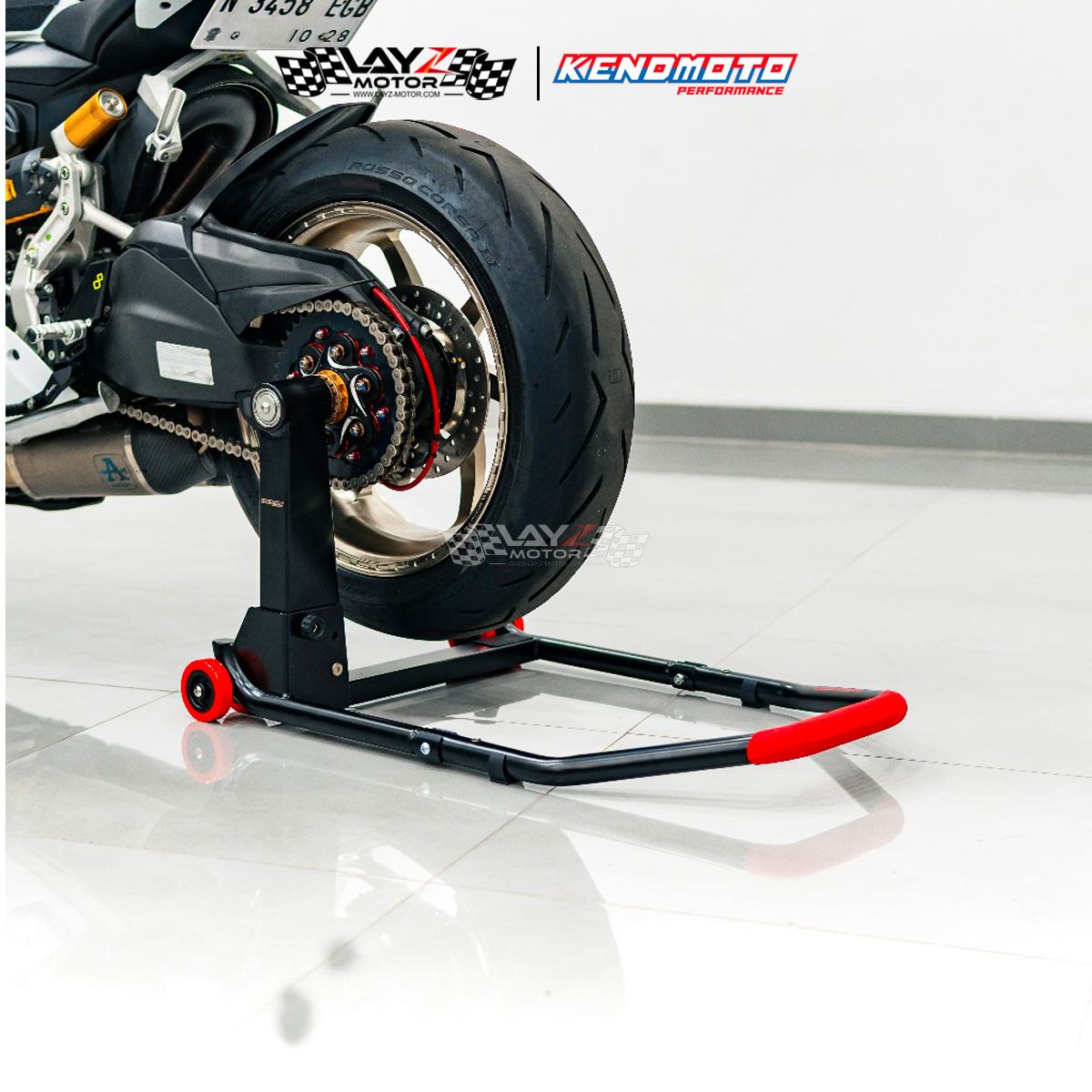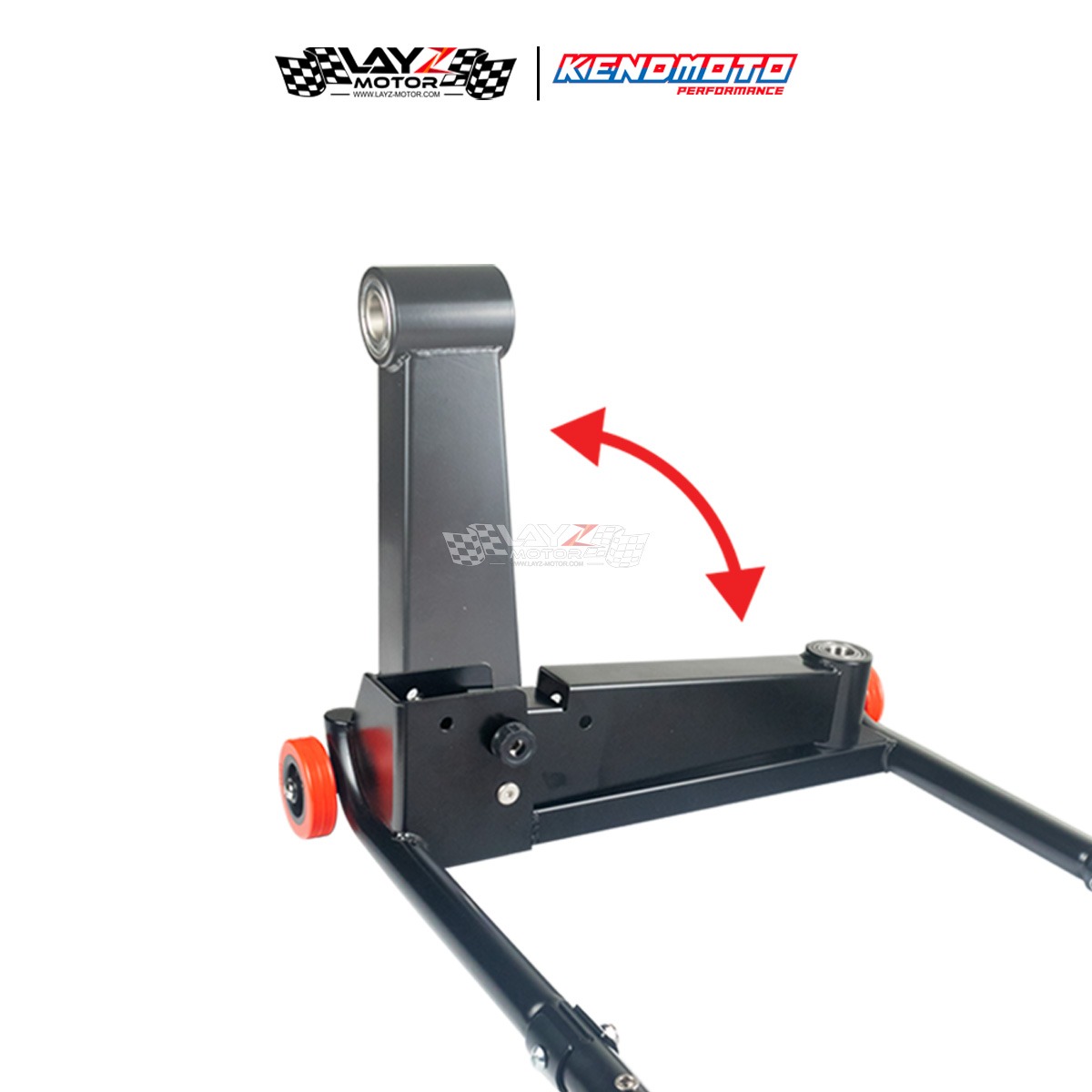 Rear Single Arm Paddock Kendmoto yang menggunakan material besi yang sangat kuat dan mampu menopang bobot motor hingga 1400cc serta dilapisi finishing powder coating sehingga memiliki daya tahan terhadap goresan dan karat yang lebih baik